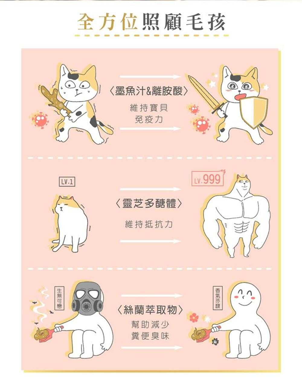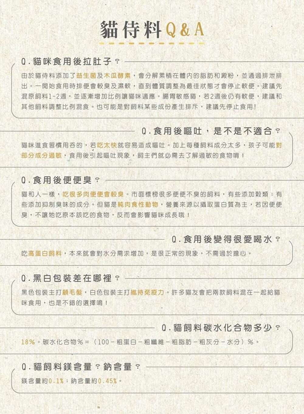 蛋白質42%↑、脂肪16%↑、纖維5%↓、水分10%↓、鈣1.1%↑、磷1%↑、灰分9%↓、牛磺酸0.15%↑