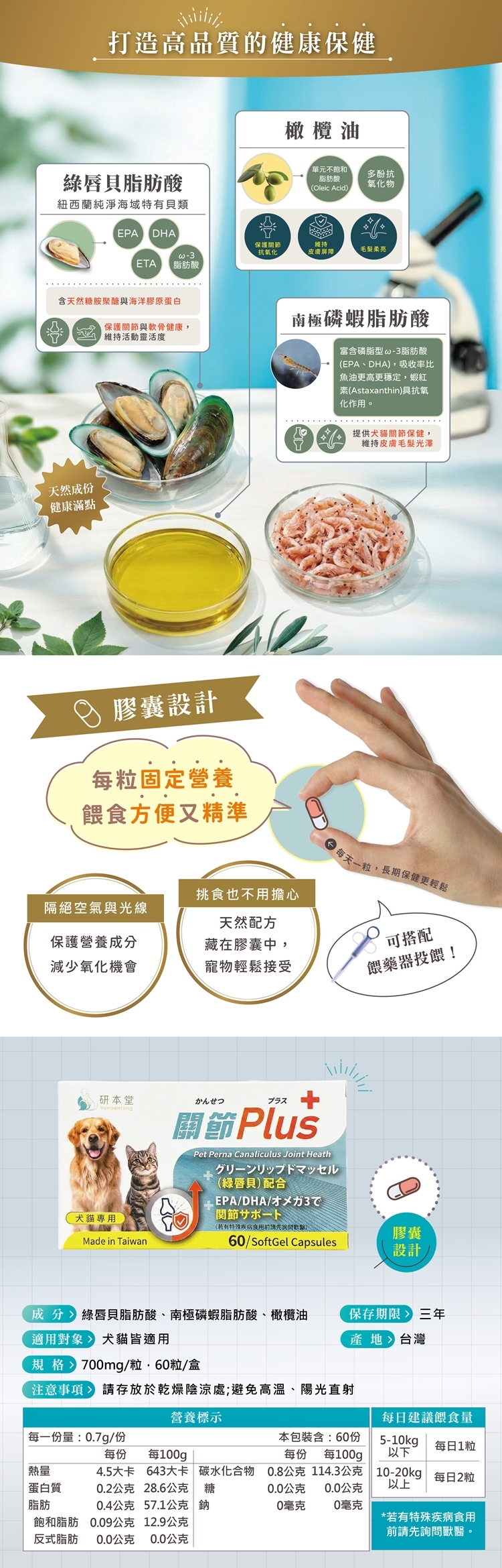 成分:綠唇貝脂肪酸、南極磷蝦脂肪酸、橄欖油。