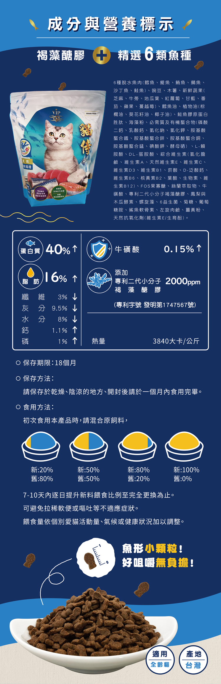 蛋白質40%、脂肪16%、粗纖維3%、灰份9%、水分8%、鈣1.1%、磷1%、Omega-3 1.8%、Omega-6  2%、牛磺酸0.15%、專利二代小分子褐藻醣膠2000ppm