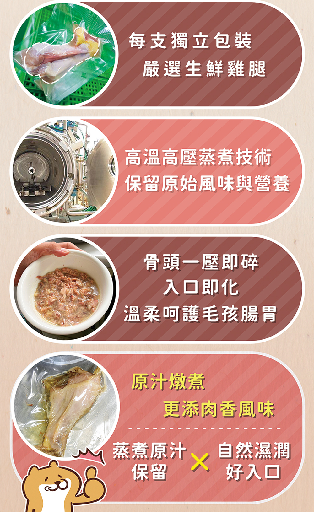 ◆嚴選生鮮雞腿,高溫高壓殺菌蒸煮技術,保留雞肉全風味營養